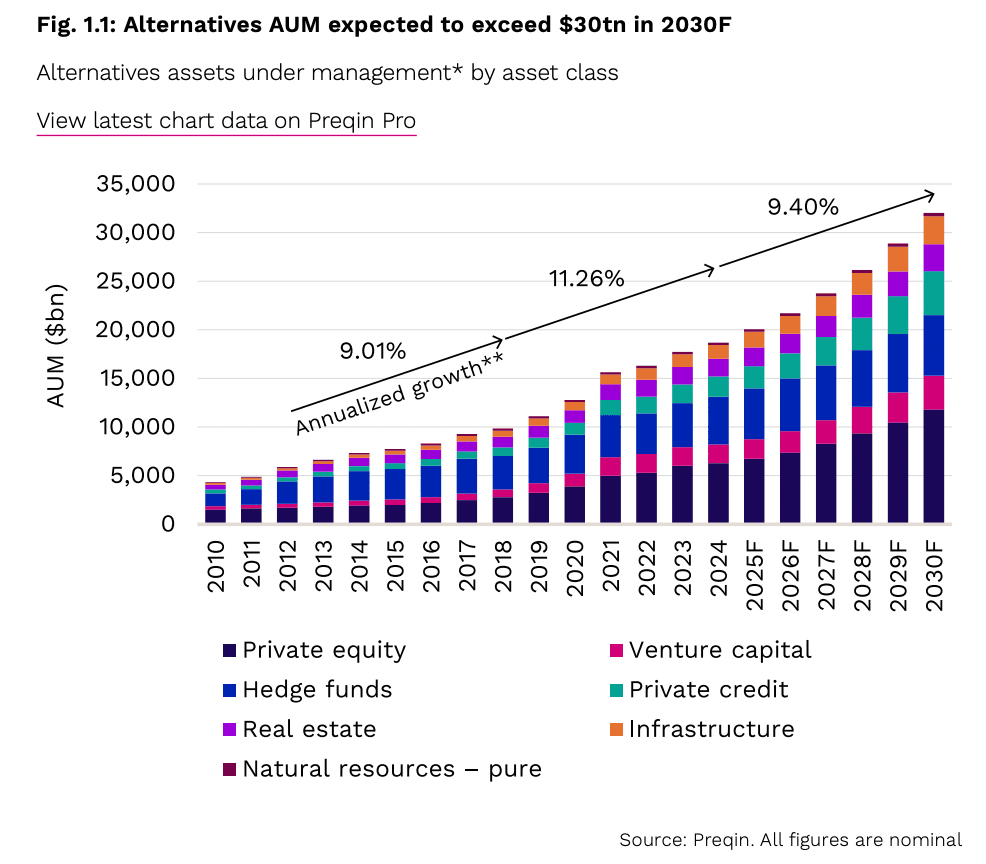 Private markets AUM (assets under management) growth is filling the public markets gaps, as shown below.