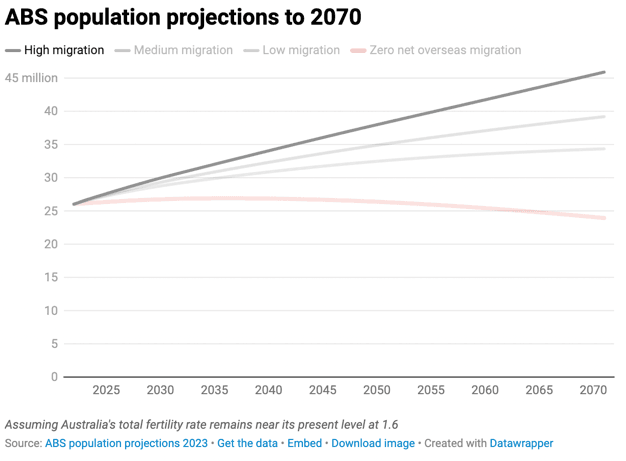 Like healthcare, the childcare sector is positioned to benefit from a growing population of parents and children needing its services. Enter demographics as a structural growth driver. In particular, net immigration represents a consistent, long-term growth driver for the sector. The numbers are compelling. Net overseas migration added 536k people to the Australian population in FY24, 446k in FY24, and a projected 335k in FY25. If those net migration numbers were to continue, the population growth outlook is roughly aligned with the ABS’s high migration scenario presented below.
